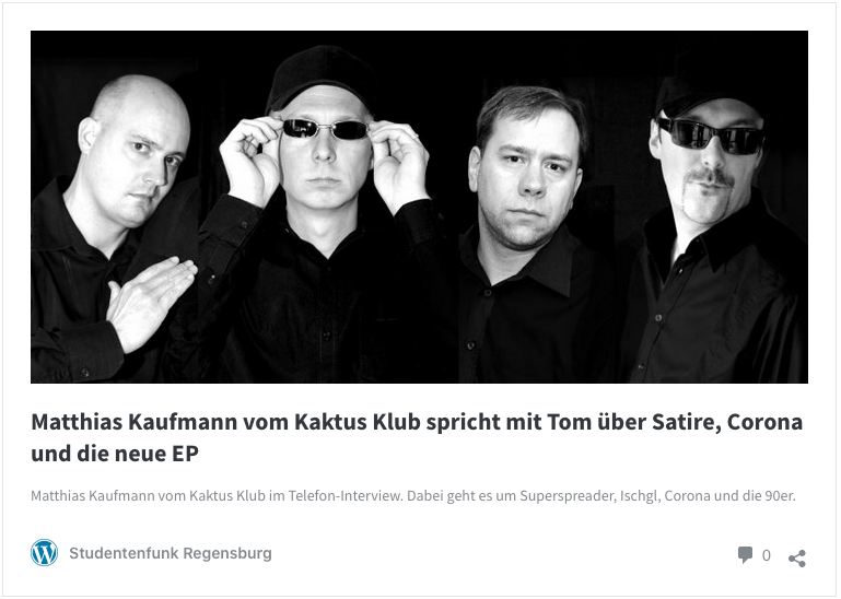 Was darf Satire in Zeiten von Corona? Und wie nimmt man eigentlich eine Platte auf, wenn man einander nicht treffen kann? Tom Himmelrath vom Studentenfunk Regensburg hat Matthias interviewt und mit ihm über die neue EP „Superspreader“ gesprochen – und über alle anderen Kaktus-Klub-Aufnahmen.