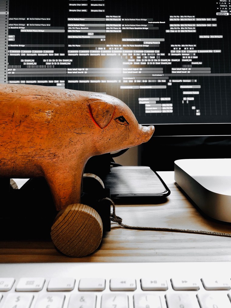 Yep, dit is richtig. Und wir stecken aktuell mitten in den Vorbereitungen. Während diese Zeilen geschrieben werden, spielt sich Helmut im Aufnahmeraum die Fingerkuppen auf der Gitarre wund. Und auf seinem neuen Akustikbass, by the way. Unser Rebellenschwein ist am Mischpult mit von der Partie – siehe das Foto oben.