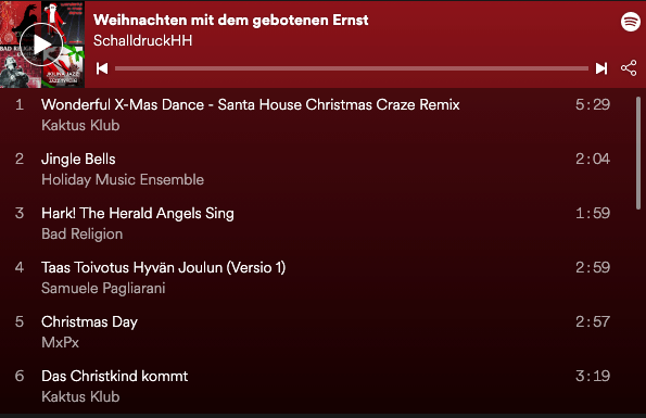 Aber wir haben eine Playlist erstellt, mit der Ihr Euch schon mal auf Weihnachten einstimmen könnt. Ihr erinnert Euch: Das ist der Tag, an dem man die osteurpäischen Kanonschläge fürs Feuerwerk via Darknet bestellt und sich fragt, ob am bevorstehenden Rosenmontag nochmal die gleichen Strapse zum Einsatz kommen wie voriges Jahr.